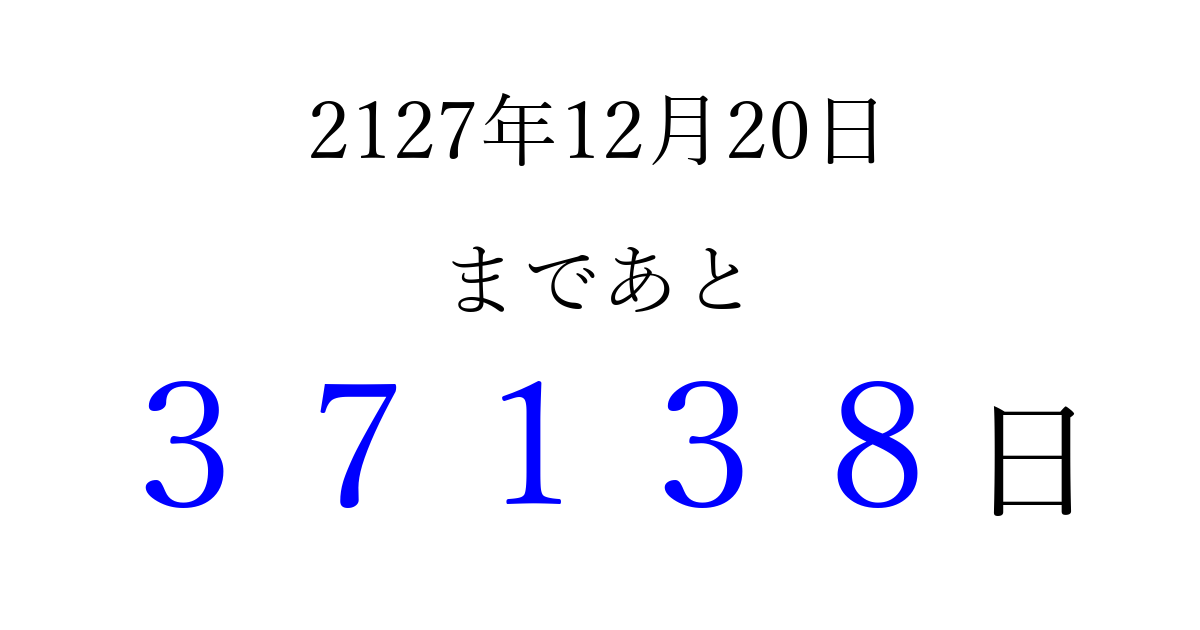 2127年12月20日(土)まで あと 99999 日です 追加すると、トップページからすぐ選べるようになります ※2026/04/15現在の結果です。 最新の状態に更新する ↓シェアして、タイムライン上にカウントダウンを表示しよう!↓ 📤 この結果を共有する Tweet シェア Threads Bluesky 別の日付でカウントダウン 2127年12月のカレンダー このページをブックマークに追加すると、いつでもカウントダウンを確認できます。 (PC: Ctrl+D / Mac: ⌘+D) hitome-notes.comでは以下のページも運営しています。 指定日と期間から日付を計算 | ガチャ確率計算・シミュレーション | プライバシー・ポリシー 運営者:Avocado