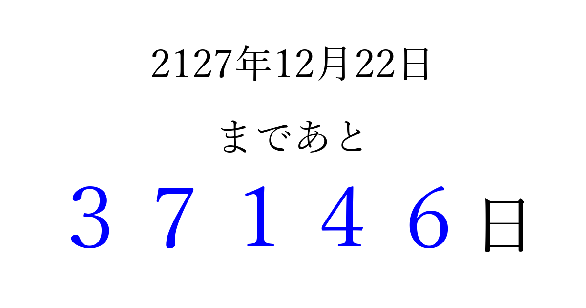 2127年12月22日(月)まで あと 99999 日です 追加すると、トップページからすぐ選べるようになります ※2026/04/09現在の結果です。 最新の状態に更新する ↓シェアして、タイムライン上にカウントダウンを表示しよう!↓ 📤 この結果を共有する Tweet シェア Threads Bluesky 別の日付でカウントダウン 2127年12月のカレンダー このページをブックマークに追加すると、いつでもカウントダウンを確認できます。 (PC: Ctrl+D / Mac: ⌘+D) hitome-notes.comでは以下のページも運営しています。 指定日と期間から日付を計算 | ガチャ確率計算・シミュレーション | プライバシー・ポリシー 運営者:Avocado