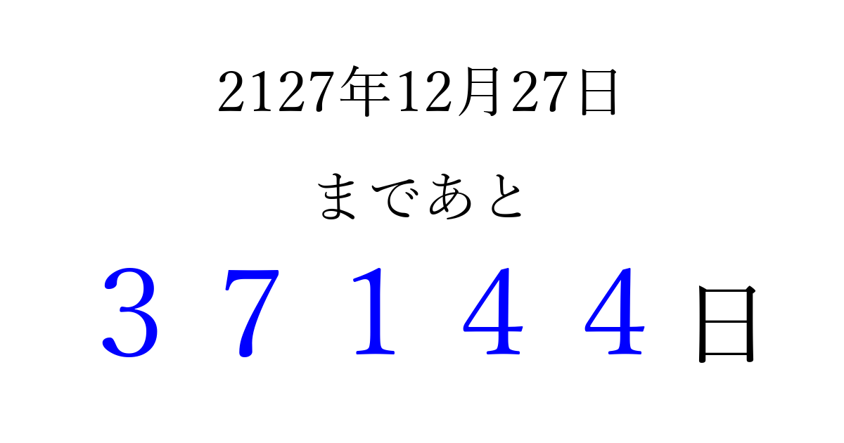 2127年12月27日(土)まで あと 99999 日です 追加すると、トップページからすぐ選べるようになります ※2026/04/16現在の結果です。 最新の状態に更新する ↓シェアして、タイムライン上にカウントダウンを表示しよう!↓ 📤 この結果を共有する Tweet シェア Threads Bluesky 別の日付でカウントダウン 2127年12月のカレンダー このページをブックマークに追加すると、いつでもカウントダウンを確認できます。 (PC: Ctrl+D / Mac: ⌘+D) hitome-notes.comでは以下のページも運営しています。 指定日と期間から日付を計算 | ガチャ確率計算・シミュレーション | プライバシー・ポリシー 運営者:Avocado