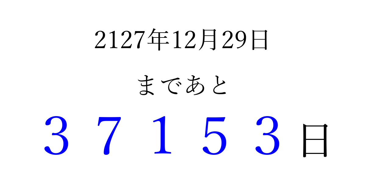 2127年12月29日(月)まで あと 99999 日です 追加すると、トップページからすぐ選べるようになります ※2026/04/09現在の結果です。 最新の状態に更新する ↓シェアして、タイムライン上にカウントダウンを表示しよう!↓ 📤 この結果を共有する Tweet シェア Threads Bluesky 別の日付でカウントダウン 2127年12月のカレンダー このページをブックマークに追加すると、いつでもカウントダウンを確認できます。 (PC: Ctrl+D / Mac: ⌘+D) hitome-notes.comでは以下のページも運営しています。 指定日と期間から日付を計算 | ガチャ確率計算・シミュレーション | プライバシー・ポリシー 運営者:Avocado