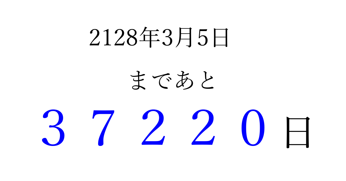 2128年3月5日(金)まで あと 99999 日です 追加すると、トップページからすぐ選べるようになります ※2026/04/09現在の結果です。 最新の状態に更新する ↓シェアして、タイムライン上にカウントダウンを表示しよう!↓ 📤 この結果を共有する Tweet シェア Threads Bluesky 別の日付でカウントダウン 2128年3月のカレンダー このページをブックマークに追加すると、いつでもカウントダウンを確認できます。 (PC: Ctrl+D / Mac: ⌘+D) hitome-notes.comでは以下のページも運営しています。 指定日と期間から日付を計算 | ガチャ確率計算・シミュレーション | プライバシー・ポリシー 運営者:Avocado