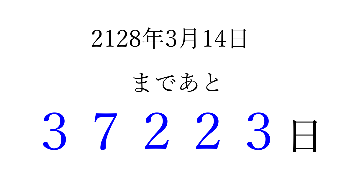 2128年3月14日(日)まで あと 99999 日です 追加すると、トップページからすぐ選べるようになります ※2026/04/15現在の結果です。 最新の状態に更新する ↓シェアして、タイムライン上にカウントダウンを表示しよう!↓ 📤 この結果を共有する Tweet シェア Threads Bluesky 別の日付でカウントダウン 2128年3月のカレンダー このページをブックマークに追加すると、いつでもカウントダウンを確認できます。 (PC: Ctrl+D / Mac: ⌘+D) hitome-notes.comでは以下のページも運営しています。 指定日と期間から日付を計算 | ガチャ確率計算・シミュレーション | プライバシー・ポリシー 運営者:Avocado