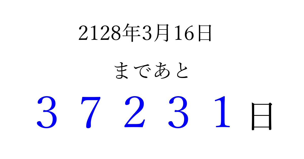 2128年3月16日(火)まで あと 99999 日です 追加すると、トップページからすぐ選べるようになります ※2026/04/09現在の結果です。 最新の状態に更新する ↓シェアして、タイムライン上にカウントダウンを表示しよう!↓ 📤 この結果を共有する Tweet シェア Threads Bluesky 別の日付でカウントダウン 2128年3月のカレンダー このページをブックマークに追加すると、いつでもカウントダウンを確認できます。 (PC: Ctrl+D / Mac: ⌘+D) hitome-notes.comでは以下のページも運営しています。 指定日と期間から日付を計算 | ガチャ確率計算・シミュレーション | プライバシー・ポリシー 運営者:Avocado