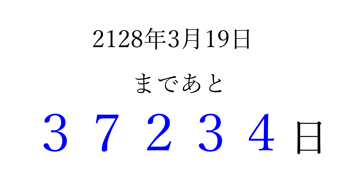 2128年3月19日(金)まで あと 99999 日です 追加すると、トップページからすぐ選べるようになります ※2026/04/09現在の結果です。 最新の状態に更新する ↓シェアして、タイムライン上にカウントダウンを表示しよう!↓ 📤 この結果を共有する Tweet シェア Threads Bluesky 別の日付でカウントダウン 2128年3月のカレンダー このページをブックマークに追加すると、いつでもカウントダウンを確認できます。 (PC: Ctrl+D / Mac: ⌘+D) hitome-notes.comでは以下のページも運営しています。 指定日と期間から日付を計算 | ガチャ確率計算・シミュレーション | プライバシー・ポリシー 運営者:Avocado