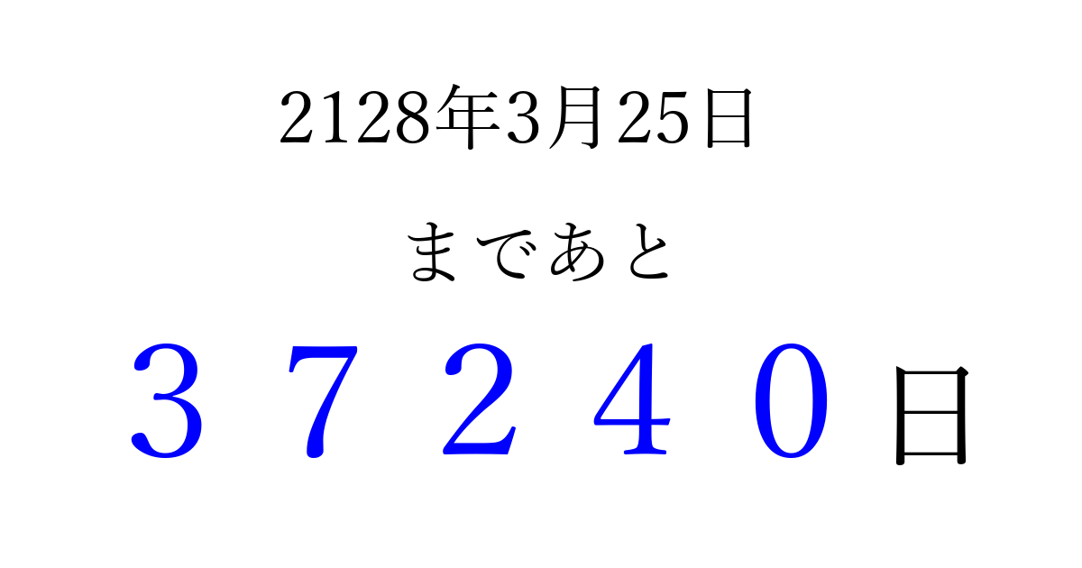 2128年3月25日(木)まで あと 99999 日です 追加すると、トップページからすぐ選べるようになります ※2026/04/09現在の結果です。 最新の状態に更新する ↓シェアして、タイムライン上にカウントダウンを表示しよう!↓ 📤 この結果を共有する Tweet シェア Threads Bluesky 別の日付でカウントダウン 2128年3月のカレンダー このページをブックマークに追加すると、いつでもカウントダウンを確認できます。 (PC: Ctrl+D / Mac: ⌘+D) hitome-notes.comでは以下のページも運営しています。 指定日と期間から日付を計算 | ガチャ確率計算・シミュレーション | プライバシー・ポリシー 運営者:Avocado