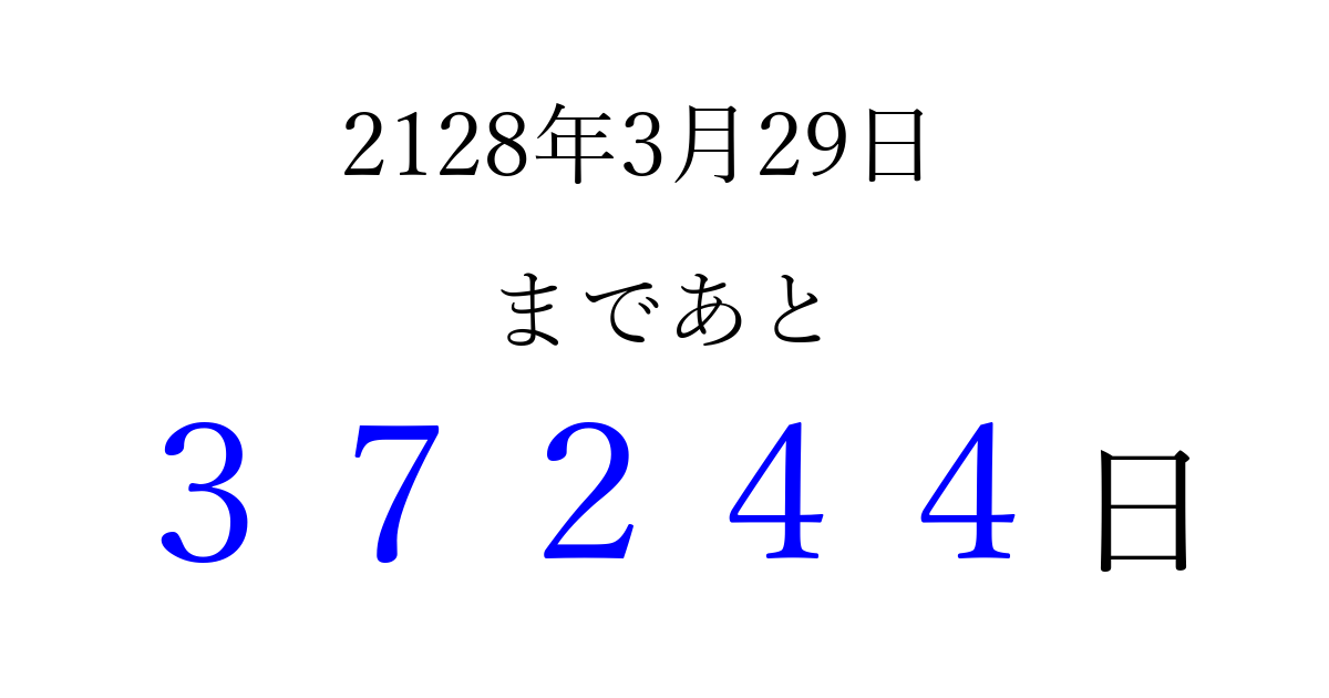 2128年3月29日(月)まで あと 99999 日です 追加すると、トップページからすぐ選べるようになります ※2026/04/09現在の結果です。 最新の状態に更新する ↓シェアして、タイムライン上にカウントダウンを表示しよう!↓ 📤 この結果を共有する Tweet シェア Threads Bluesky 別の日付でカウントダウン 2128年3月のカレンダー このページをブックマークに追加すると、いつでもカウントダウンを確認できます。 (PC: Ctrl+D / Mac: ⌘+D) hitome-notes.comでは以下のページも運営しています。 指定日と期間から日付を計算 | ガチャ確率計算・シミュレーション | プライバシー・ポリシー 運営者:Avocado