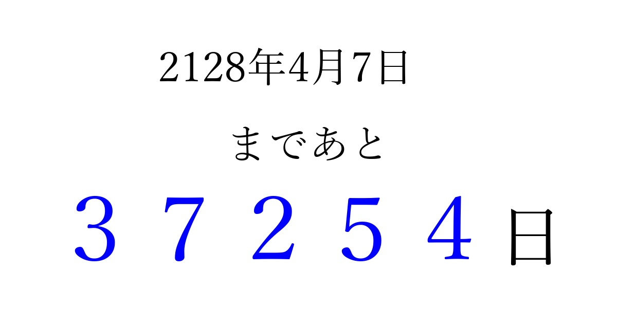 2128年4月7日(水)まで あと 99999 日です 追加すると、トップページからすぐ選べるようになります ※2026/04/08現在の結果です。 最新の状態に更新する ↓シェアして、タイムライン上にカウントダウンを表示しよう!↓ 📤 この結果を共有する Tweet シェア Threads Bluesky 別の日付でカウントダウン 2128年4月のカレンダー このページをブックマークに追加すると、いつでもカウントダウンを確認できます。 (PC: Ctrl+D / Mac: ⌘+D) hitome-notes.comでは以下のページも運営しています。 指定日と期間から日付を計算 | ガチャ確率計算・シミュレーション | プライバシー・ポリシー 運営者:Avocado
