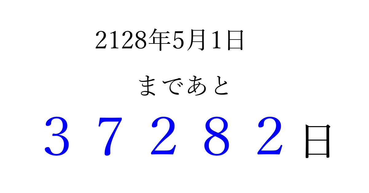 2128年5月1日(土)まで あと 99999 日です 追加すると、トップページからすぐ選べるようになります ※2026/04/04現在の結果です。 最新の状態に更新する ↓シェアして、タイムライン上にカウントダウンを表示しよう!↓ 📤 この結果を共有する Tweet シェア Threads Bluesky 別の日付でカウントダウン 2128年5月のカレンダー このページをブックマークに追加すると、いつでもカウントダウンを確認できます。 (PC: Ctrl+D / Mac: ⌘+D) hitome-notes.comでは以下のページも運営しています。 指定日と期間から日付を計算 | ガチャ確率計算・シミュレーション | プライバシー・ポリシー 運営者:Avocado