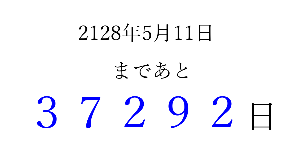 2128年5月11日(火)まで あと 99999 日です 追加すると、トップページからすぐ選べるようになります ※2026/04/04現在の結果です。 最新の状態に更新する ↓シェアして、タイムライン上にカウントダウンを表示しよう!↓ 📤 この結果を共有する Tweet シェア Threads Bluesky 別の日付でカウントダウン 2128年5月のカレンダー このページをブックマークに追加すると、いつでもカウントダウンを確認できます。 (PC: Ctrl+D / Mac: ⌘+D) hitome-notes.comでは以下のページも運営しています。 指定日と期間から日付を計算 | ガチャ確率計算・シミュレーション | プライバシー・ポリシー 運営者:Avocado