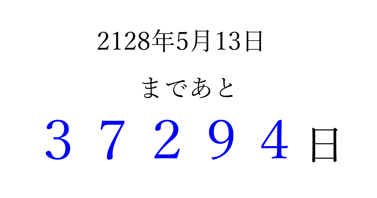 2128年5月13日(木)まで あと 99999 日です 追加すると、トップページからすぐ選べるようになります ※2026/04/04現在の結果です。 最新の状態に更新する ↓シェアして、タイムライン上にカウントダウンを表示しよう!↓ 📤 この結果を共有する Tweet シェア Threads Bluesky 別の日付でカウントダウン 2128年5月のカレンダー このページをブックマークに追加すると、いつでもカウントダウンを確認できます。 (PC: Ctrl+D / Mac: ⌘+D) hitome-notes.comでは以下のページも運営しています。 指定日と期間から日付を計算 | ガチャ確率計算・シミュレーション | プライバシー・ポリシー 運営者:Avocado