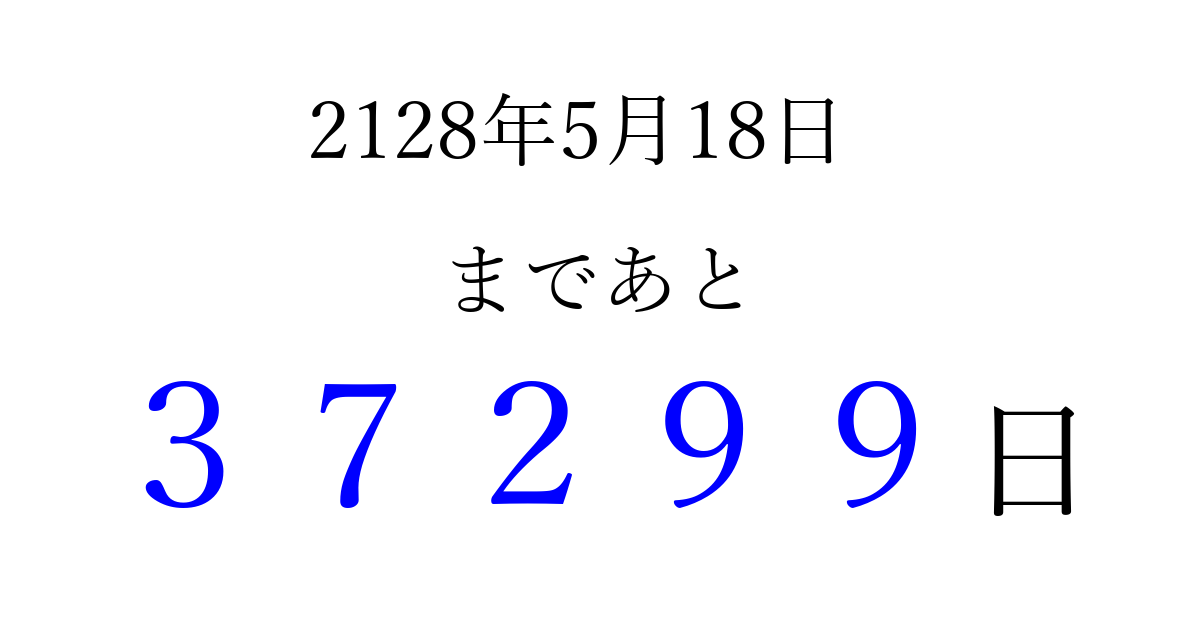 2128年5月18日(火)まで あと 99999 日です 追加すると、トップページからすぐ選べるようになります ※2026/04/04現在の結果です。 最新の状態に更新する ↓シェアして、タイムライン上にカウントダウンを表示しよう!↓ 📤 この結果を共有する Tweet シェア Threads Bluesky 別の日付でカウントダウン 2128年5月のカレンダー このページをブックマークに追加すると、いつでもカウントダウンを確認できます。 (PC: Ctrl+D / Mac: ⌘+D) hitome-notes.comでは以下のページも運営しています。 指定日と期間から日付を計算 | ガチャ確率計算・シミュレーション | プライバシー・ポリシー 運営者:Avocado