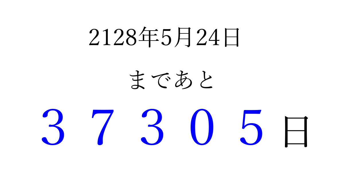 2128年5月24日(月)まで あと 99999 日です 追加すると、トップページからすぐ選べるようになります ※2026/04/04現在の結果です。 最新の状態に更新する ↓シェアして、タイムライン上にカウントダウンを表示しよう!↓ 📤 この結果を共有する Tweet シェア Threads Bluesky 別の日付でカウントダウン 2128年5月のカレンダー このページをブックマークに追加すると、いつでもカウントダウンを確認できます。 (PC: Ctrl+D / Mac: ⌘+D) hitome-notes.comでは以下のページも運営しています。 指定日と期間から日付を計算 | ガチャ確率計算・シミュレーション | プライバシー・ポリシー 運営者:Avocado