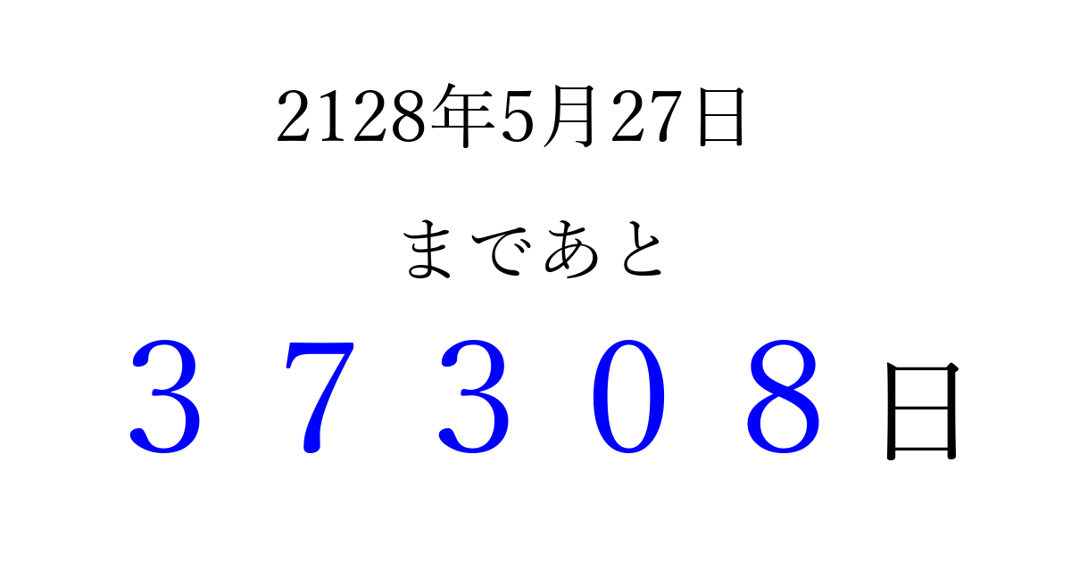 2128年5月27日(木)まで あと 99999 日です 追加すると、トップページからすぐ選べるようになります ※2026/04/04現在の結果です。 最新の状態に更新する ↓シェアして、タイムライン上にカウントダウンを表示しよう!↓ 📤 この結果を共有する Tweet シェア Threads Bluesky 別の日付でカウントダウン 2128年5月のカレンダー このページをブックマークに追加すると、いつでもカウントダウンを確認できます。 (PC: Ctrl+D / Mac: ⌘+D) hitome-notes.comでは以下のページも運営しています。 指定日と期間から日付を計算 | ガチャ確率計算・シミュレーション | プライバシー・ポリシー 運営者:Avocado