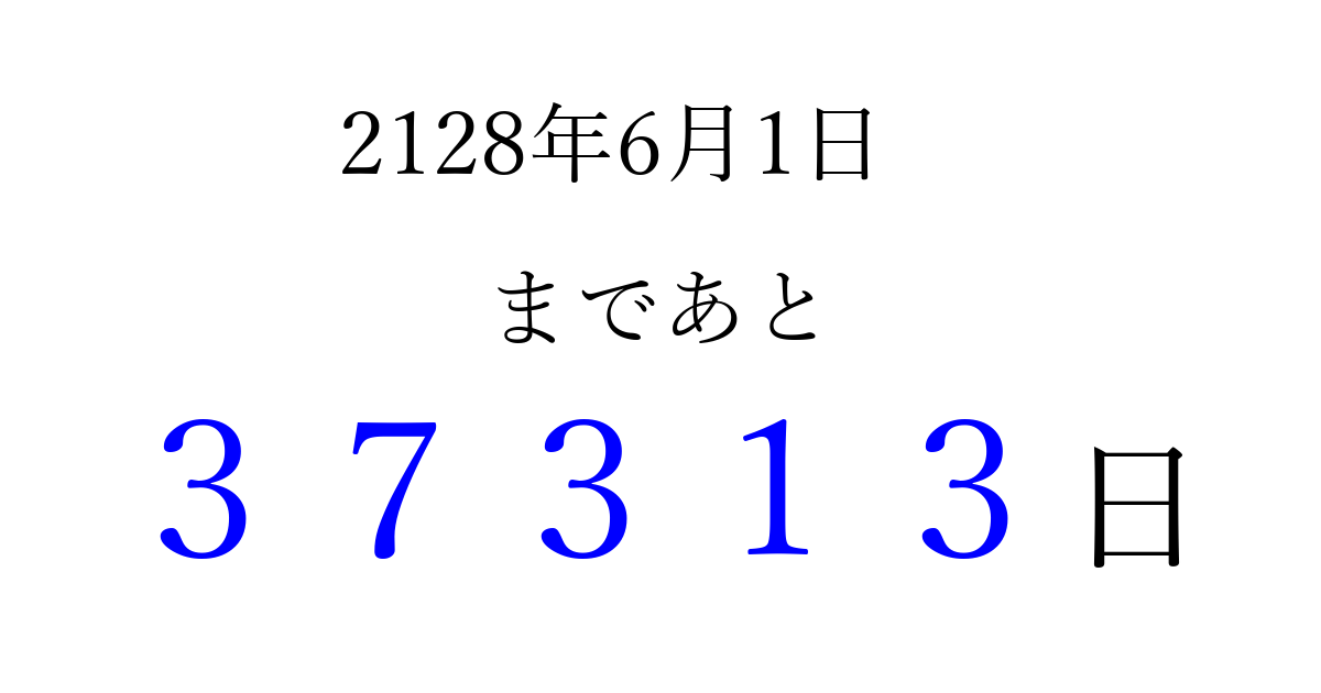 2128年6月1日(火)まで あと 99999 日です 追加すると、トップページからすぐ選べるようになります ※2026/04/04現在の結果です。 最新の状態に更新する ↓シェアして、タイムライン上にカウントダウンを表示しよう!↓ 📤 この結果を共有する Tweet シェア Threads Bluesky 別の日付でカウントダウン 2128年6月のカレンダー このページをブックマークに追加すると、いつでもカウントダウンを確認できます。 (PC: Ctrl+D / Mac: ⌘+D) hitome-notes.comでは以下のページも運営しています。 指定日と期間から日付を計算 | ガチャ確率計算・シミュレーション | プライバシー・ポリシー 運営者:Avocado