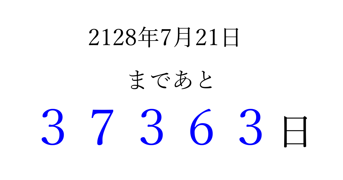 2128年7月21日(水)まで あと 99999 日です 追加すると、トップページからすぐ選べるようになります ※2026/04/04現在の結果です。 最新の状態に更新する ↓シェアして、タイムライン上にカウントダウンを表示しよう!↓ 📤 この結果を共有する Tweet シェア Threads Bluesky 別の日付でカウントダウン 2128年7月のカレンダー このページをブックマークに追加すると、いつでもカウントダウンを確認できます。 (PC: Ctrl+D / Mac: ⌘+D) hitome-notes.comでは以下のページも運営しています。 指定日と期間から日付を計算 | ガチャ確率計算・シミュレーション | プライバシー・ポリシー 運営者:Avocado