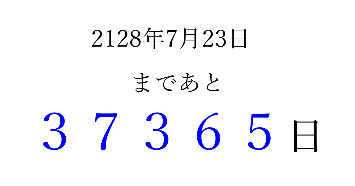 2128年7月23日(金)まで あと 99999 日です 追加すると、トップページからすぐ選べるようになります ※2026/04/04現在の結果です。 最新の状態に更新する ↓シェアして、タイムライン上にカウントダウンを表示しよう!↓ 📤 この結果を共有する Tweet シェア Threads Bluesky 別の日付でカウントダウン 2128年7月のカレンダー このページをブックマークに追加すると、いつでもカウントダウンを確認できます。 (PC: Ctrl+D / Mac: ⌘+D) hitome-notes.comでは以下のページも運営しています。 指定日と期間から日付を計算 | ガチャ確率計算・シミュレーション | プライバシー・ポリシー 運営者:Avocado