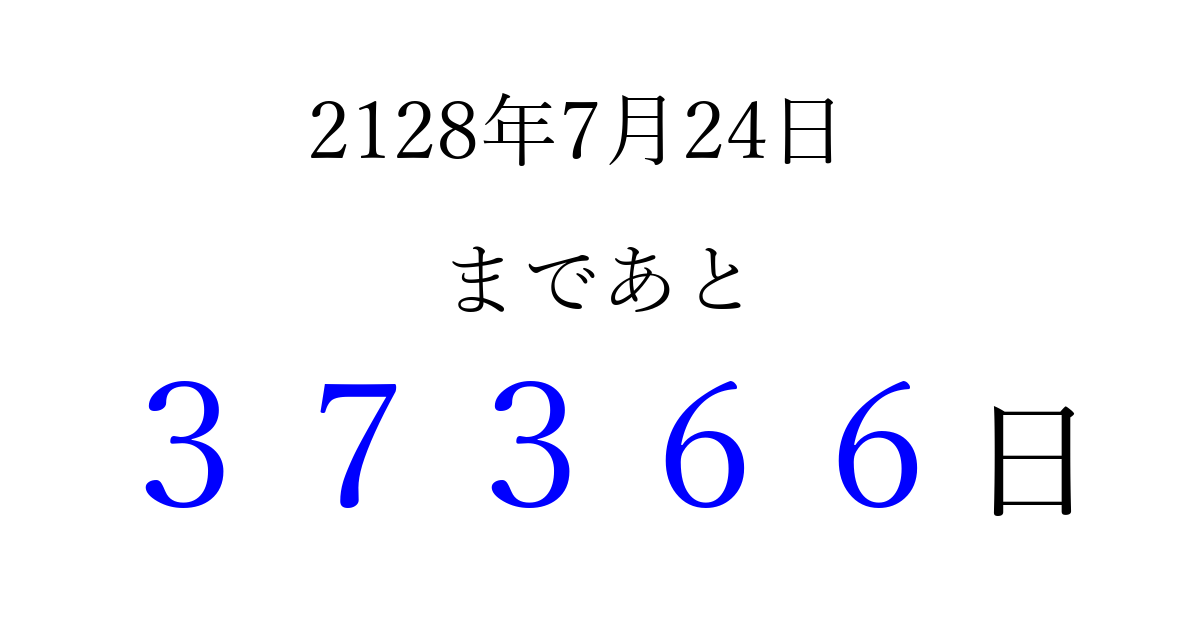 2128年7月24日(土)まで あと 99999 日です 追加すると、トップページからすぐ選べるようになります ※2026/04/04現在の結果です。 最新の状態に更新する ↓シェアして、タイムライン上にカウントダウンを表示しよう!↓ 📤 この結果を共有する Tweet シェア Threads Bluesky 別の日付でカウントダウン 2128年7月のカレンダー このページをブックマークに追加すると、いつでもカウントダウンを確認できます。 (PC: Ctrl+D / Mac: ⌘+D) hitome-notes.comでは以下のページも運営しています。 指定日と期間から日付を計算 | ガチャ確率計算・シミュレーション | プライバシー・ポリシー 運営者:Avocado