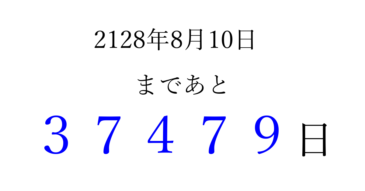 2128年8月10日(火)まで あと 99999 日です 追加すると、トップページからすぐ選べるようになります ※2025/12/29現在の結果です。 最新の状態に更新する ↓シェアして、タイムライン上にカウントダウンを表示しよう!↓ 📤 この結果を共有する Tweet シェア Threads Bluesky 別の日付でカウントダウン 2128年8月のカレンダー このページをブックマークに追加すると、いつでもカウントダウンを確認できます。 (PC: Ctrl+D / Mac: ⌘+D) hitome-notes.comでは以下のページも運営しています。 指定日と期間から日付を計算 | ガチャ確率計算・シミュレーション | プライバシー・ポリシー 運営者:Avocado