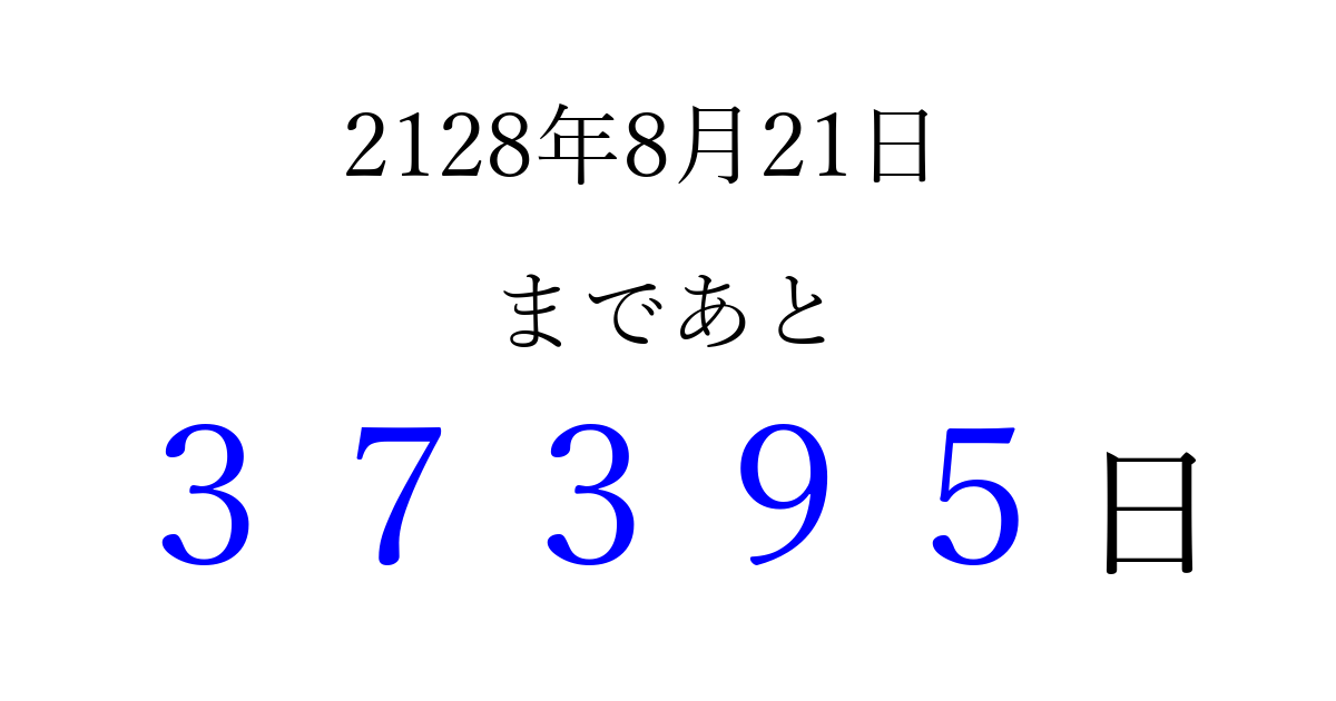 2128年8月21日(土)まで あと 99999 日です 追加すると、トップページからすぐ選べるようになります ※2026/04/03現在の結果です。 最新の状態に更新する ↓シェアして、タイムライン上にカウントダウンを表示しよう!↓ 📤 この結果を共有する Tweet シェア Threads Bluesky 別の日付でカウントダウン 2128年8月のカレンダー このページをブックマークに追加すると、いつでもカウントダウンを確認できます。 (PC: Ctrl+D / Mac: ⌘+D) hitome-notes.comでは以下のページも運営しています。 指定日と期間から日付を計算 | ガチャ確率計算・シミュレーション | プライバシー・ポリシー 運営者:Avocado