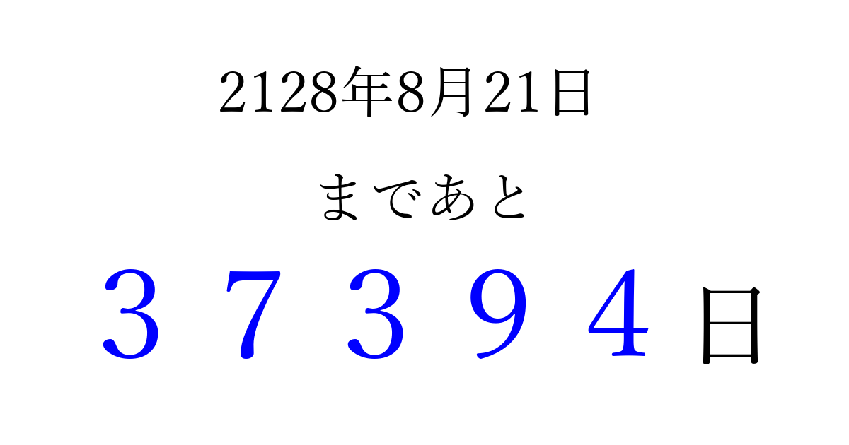 2128年8月21日(土)まで あと 99999 日です 追加すると、トップページからすぐ選べるようになります ※2026/04/04現在の結果です。 最新の状態に更新する ↓シェアして、タイムライン上にカウントダウンを表示しよう!↓ 📤 この結果を共有する Tweet シェア Threads Bluesky 別の日付でカウントダウン 2128年8月のカレンダー このページをブックマークに追加すると、いつでもカウントダウンを確認できます。 (PC: Ctrl+D / Mac: ⌘+D) hitome-notes.comでは以下のページも運営しています。 指定日と期間から日付を計算 | ガチャ確率計算・シミュレーション | プライバシー・ポリシー 運営者:Avocado