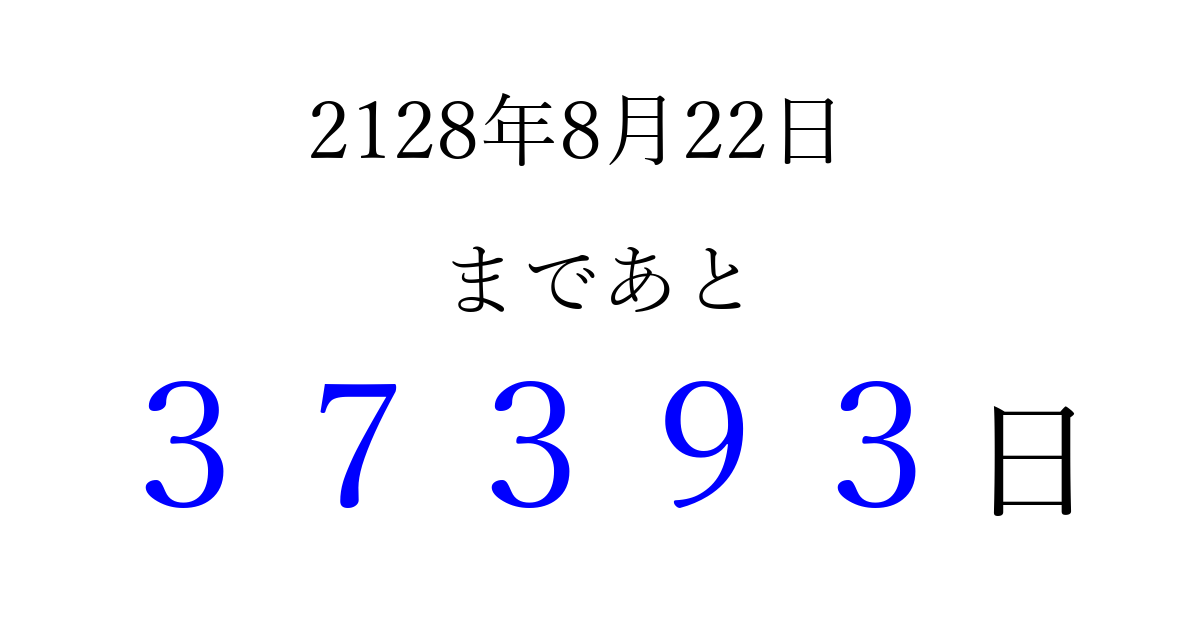 2128年8月22日(日)まで あと 99999 日です 追加すると、トップページからすぐ選べるようになります ※2026/04/06現在の結果です。 最新の状態に更新する ↓シェアして、タイムライン上にカウントダウンを表示しよう!↓ 📤 この結果を共有する Tweet シェア Threads Bluesky 別の日付でカウントダウン 2128年8月のカレンダー このページをブックマークに追加すると、いつでもカウントダウンを確認できます。 (PC: Ctrl+D / Mac: ⌘+D) hitome-notes.comでは以下のページも運営しています。 指定日と期間から日付を計算 | ガチャ確率計算・シミュレーション | プライバシー・ポリシー 運営者:Avocado