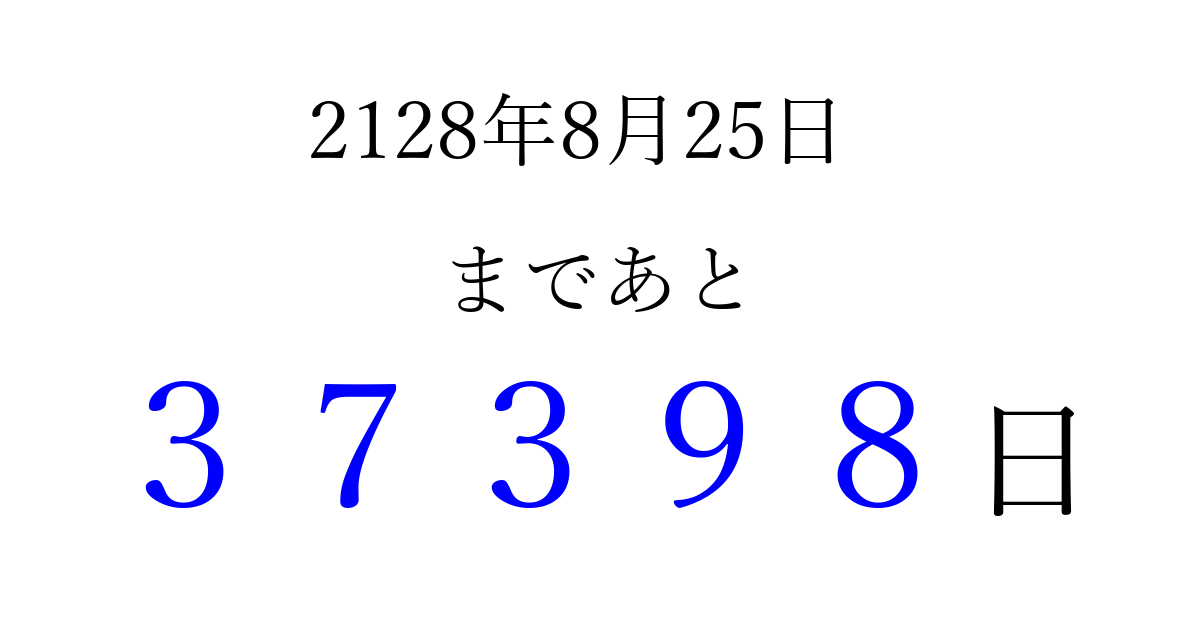 2128年8月25日(水)まで あと 99999 日です 追加すると、トップページからすぐ選べるようになります ※2026/04/04現在の結果です。 最新の状態に更新する ↓シェアして、タイムライン上にカウントダウンを表示しよう!↓ 📤 この結果を共有する Tweet シェア Threads Bluesky 別の日付でカウントダウン 2128年8月のカレンダー このページをブックマークに追加すると、いつでもカウントダウンを確認できます。 (PC: Ctrl+D / Mac: ⌘+D) hitome-notes.comでは以下のページも運営しています。 指定日と期間から日付を計算 | ガチャ確率計算・シミュレーション | プライバシー・ポリシー 運営者:Avocado