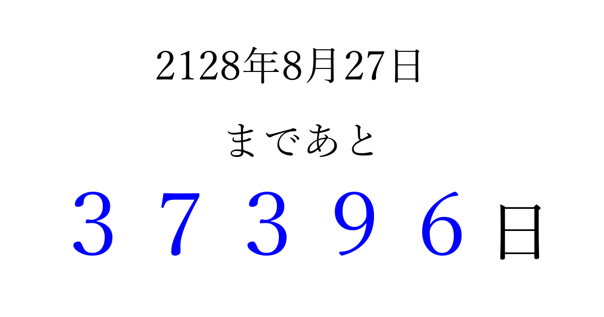 2128年8月27日(金)まで あと 99999 日です 追加すると、トップページからすぐ選べるようになります ※2026/04/08現在の結果です。 最新の状態に更新する ↓シェアして、タイムライン上にカウントダウンを表示しよう!↓ 📤 この結果を共有する Tweet シェア Threads Bluesky 別の日付でカウントダウン 2128年8月のカレンダー このページをブックマークに追加すると、いつでもカウントダウンを確認できます。 (PC: Ctrl+D / Mac: ⌘+D) hitome-notes.comでは以下のページも運営しています。 指定日と期間から日付を計算 | ガチャ確率計算・シミュレーション | プライバシー・ポリシー 運営者:Avocado