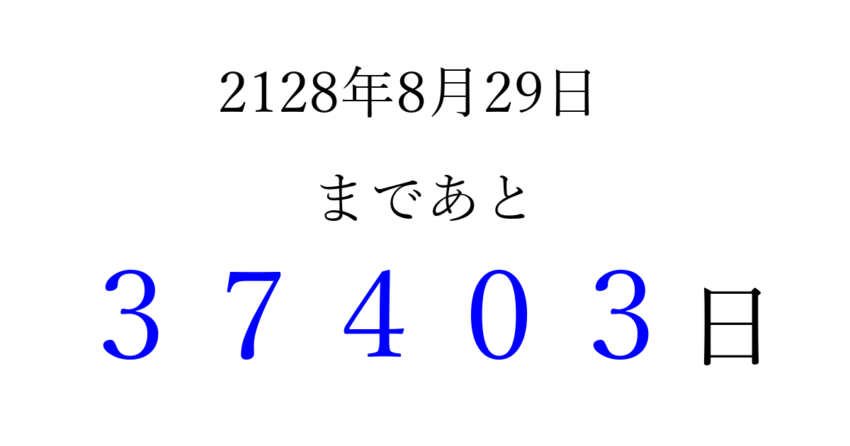 2128年8月29日(日)まで あと 99999 日です 追加すると、トップページからすぐ選べるようになります ※2026/04/03現在の結果です。 最新の状態に更新する ↓シェアして、タイムライン上にカウントダウンを表示しよう!↓ 📤 この結果を共有する Tweet シェア Threads Bluesky 別の日付でカウントダウン 2128年8月のカレンダー このページをブックマークに追加すると、いつでもカウントダウンを確認できます。 (PC: Ctrl+D / Mac: ⌘+D) hitome-notes.comでは以下のページも運営しています。 指定日と期間から日付を計算 | ガチャ確率計算・シミュレーション | プライバシー・ポリシー 運営者:Avocado