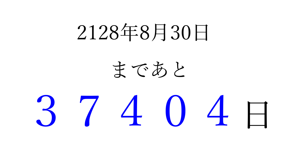 2128年8月30日(月)まで あと 99999 日です 追加すると、トップページからすぐ選べるようになります ※2026/04/03現在の結果です。 最新の状態に更新する ↓シェアして、タイムライン上にカウントダウンを表示しよう!↓ 📤 この結果を共有する Tweet シェア Threads Bluesky 別の日付でカウントダウン 2128年8月のカレンダー このページをブックマークに追加すると、いつでもカウントダウンを確認できます。 (PC: Ctrl+D / Mac: ⌘+D) hitome-notes.comでは以下のページも運営しています。 指定日と期間から日付を計算 | ガチャ確率計算・シミュレーション | プライバシー・ポリシー 運営者:Avocado