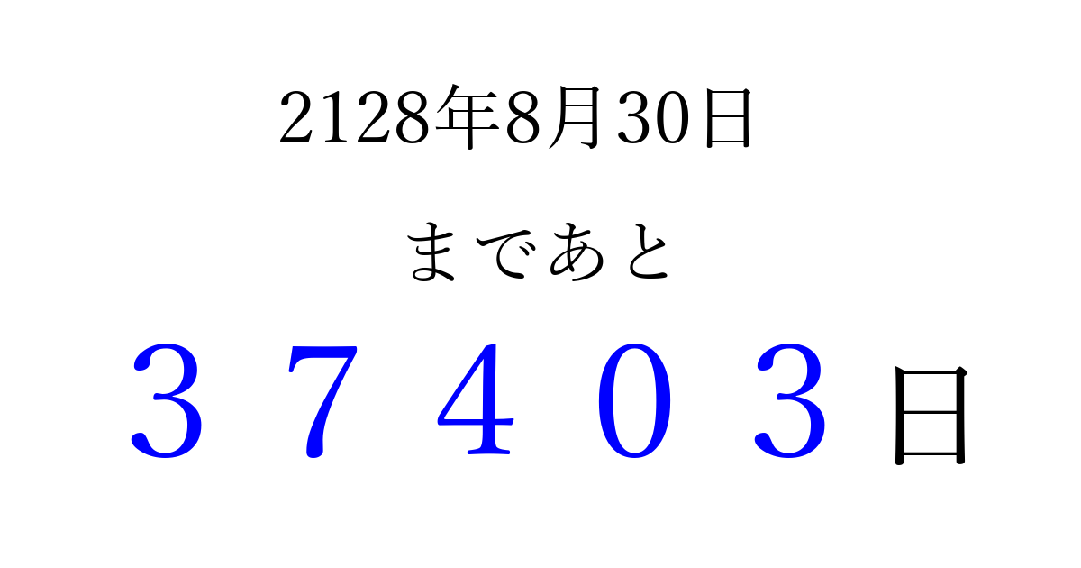 2128年8月30日(月)まで あと 99999 日です 追加すると、トップページからすぐ選べるようになります ※2026/04/04現在の結果です。 最新の状態に更新する ↓シェアして、タイムライン上にカウントダウンを表示しよう!↓ 📤 この結果を共有する Tweet シェア Threads Bluesky 別の日付でカウントダウン 2128年8月のカレンダー このページをブックマークに追加すると、いつでもカウントダウンを確認できます。 (PC: Ctrl+D / Mac: ⌘+D) hitome-notes.comでは以下のページも運営しています。 指定日と期間から日付を計算 | ガチャ確率計算・シミュレーション | プライバシー・ポリシー 運営者:Avocado