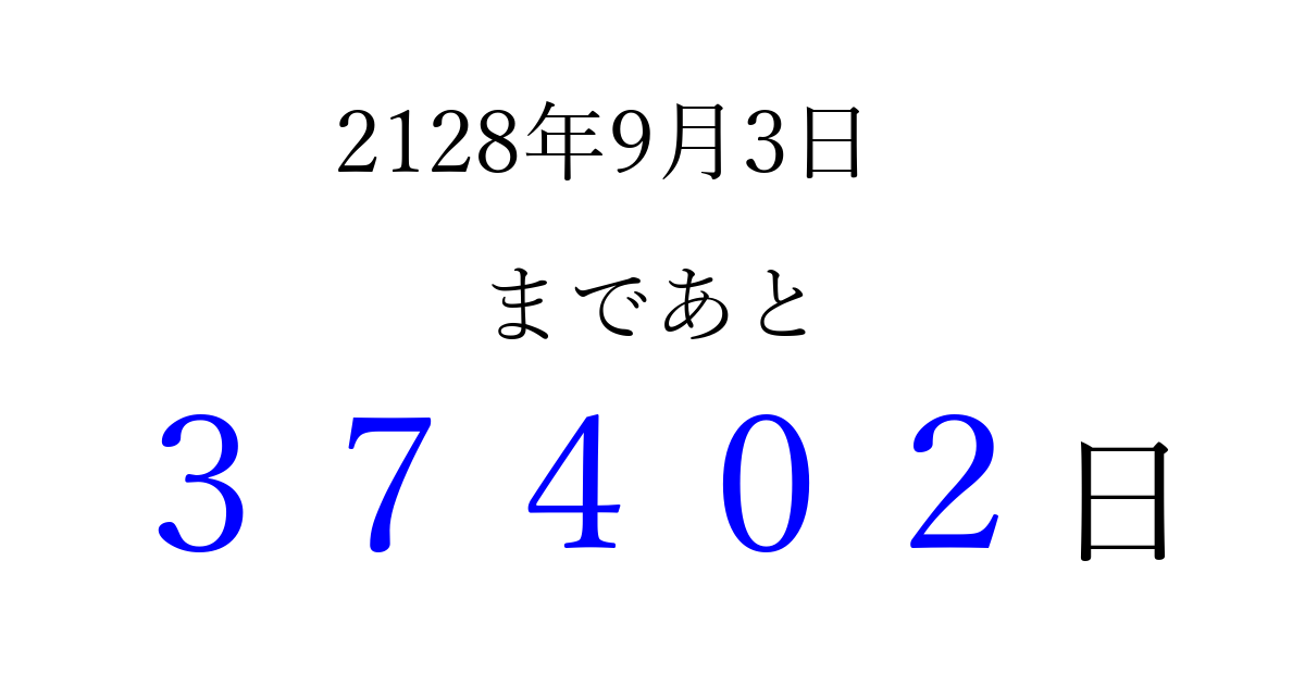 2128年9月3日(金)まで あと 99999 日です 追加すると、トップページからすぐ選べるようになります ※2026/04/09現在の結果です。 最新の状態に更新する ↓シェアして、タイムライン上にカウントダウンを表示しよう!↓ 📤 この結果を共有する Tweet シェア Threads Bluesky 別の日付でカウントダウン 2128年9月のカレンダー このページをブックマークに追加すると、いつでもカウントダウンを確認できます。 (PC: Ctrl+D / Mac: ⌘+D) hitome-notes.comでは以下のページも運営しています。 指定日と期間から日付を計算 | ガチャ確率計算・シミュレーション | プライバシー・ポリシー 運営者:Avocado