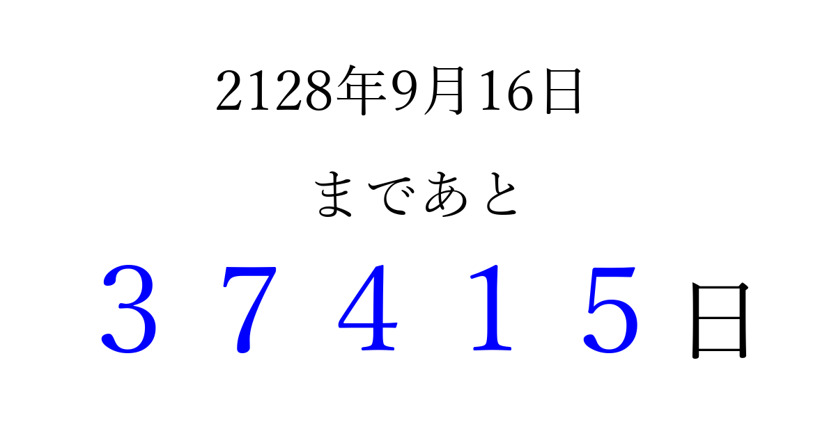 2128年9月16日(木)まで あと 99999 日です 追加すると、トップページからすぐ選べるようになります ※2026/04/09現在の結果です。 最新の状態に更新する ↓シェアして、タイムライン上にカウントダウンを表示しよう!↓ 📤 この結果を共有する Tweet シェア Threads Bluesky 別の日付でカウントダウン 2128年9月のカレンダー このページをブックマークに追加すると、いつでもカウントダウンを確認できます。 (PC: Ctrl+D / Mac: ⌘+D) hitome-notes.comでは以下のページも運営しています。 指定日と期間から日付を計算 | ガチャ確率計算・シミュレーション | プライバシー・ポリシー 運営者:Avocado