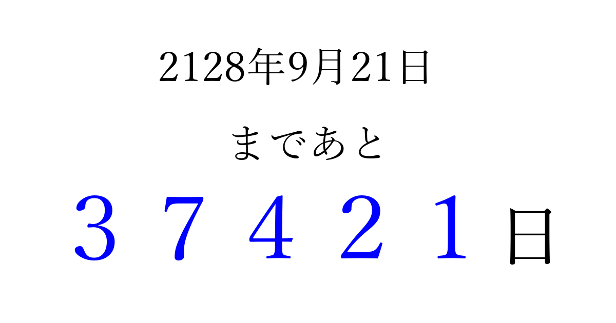 2128年9月21日(火)まで あと 99999 日です 追加すると、トップページからすぐ選べるようになります ※2026/04/08現在の結果です。 最新の状態に更新する ↓シェアして、タイムライン上にカウントダウンを表示しよう!↓ 📤 この結果を共有する Tweet シェア Threads Bluesky 別の日付でカウントダウン 2128年9月のカレンダー このページをブックマークに追加すると、いつでもカウントダウンを確認できます。 (PC: Ctrl+D / Mac: ⌘+D) hitome-notes.comでは以下のページも運営しています。 指定日と期間から日付を計算 | ガチャ確率計算・シミュレーション | プライバシー・ポリシー 運営者:Avocado