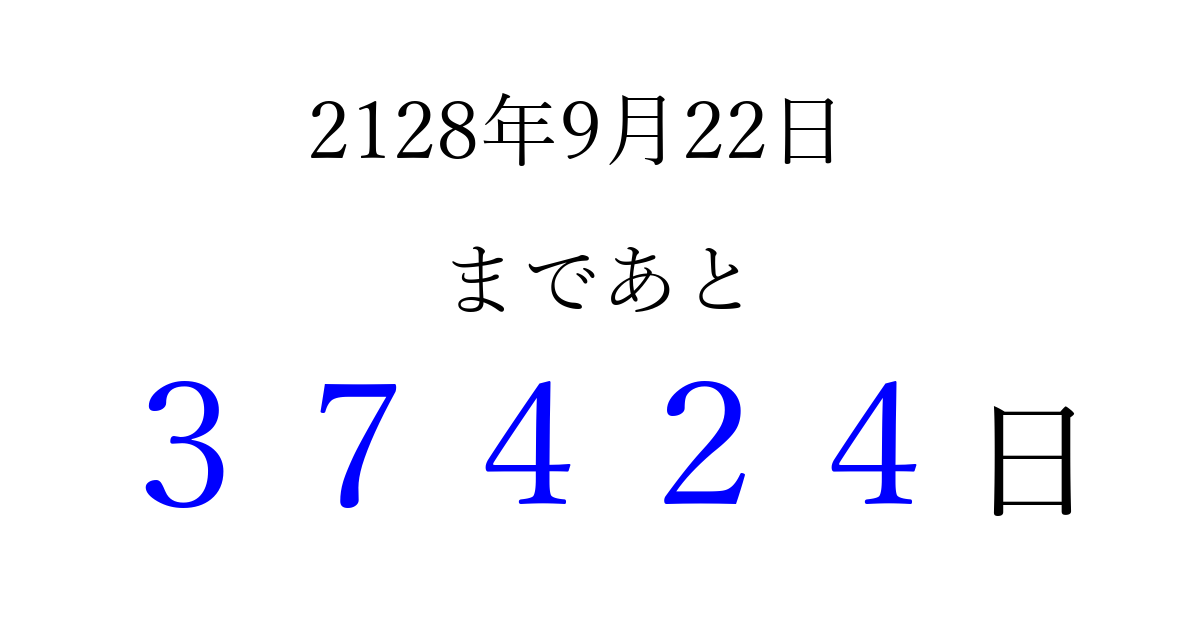 2128年9月22日(水)まで あと 99999 日です 追加すると、トップページからすぐ選べるようになります ※2026/04/06現在の結果です。 最新の状態に更新する ↓シェアして、タイムライン上にカウントダウンを表示しよう!↓ 📤 この結果を共有する Tweet シェア Threads Bluesky 別の日付でカウントダウン 2128年9月のカレンダー このページをブックマークに追加すると、いつでもカウントダウンを確認できます。 (PC: Ctrl+D / Mac: ⌘+D) hitome-notes.comでは以下のページも運営しています。 指定日と期間から日付を計算 | ガチャ確率計算・シミュレーション | プライバシー・ポリシー 運営者:Avocado