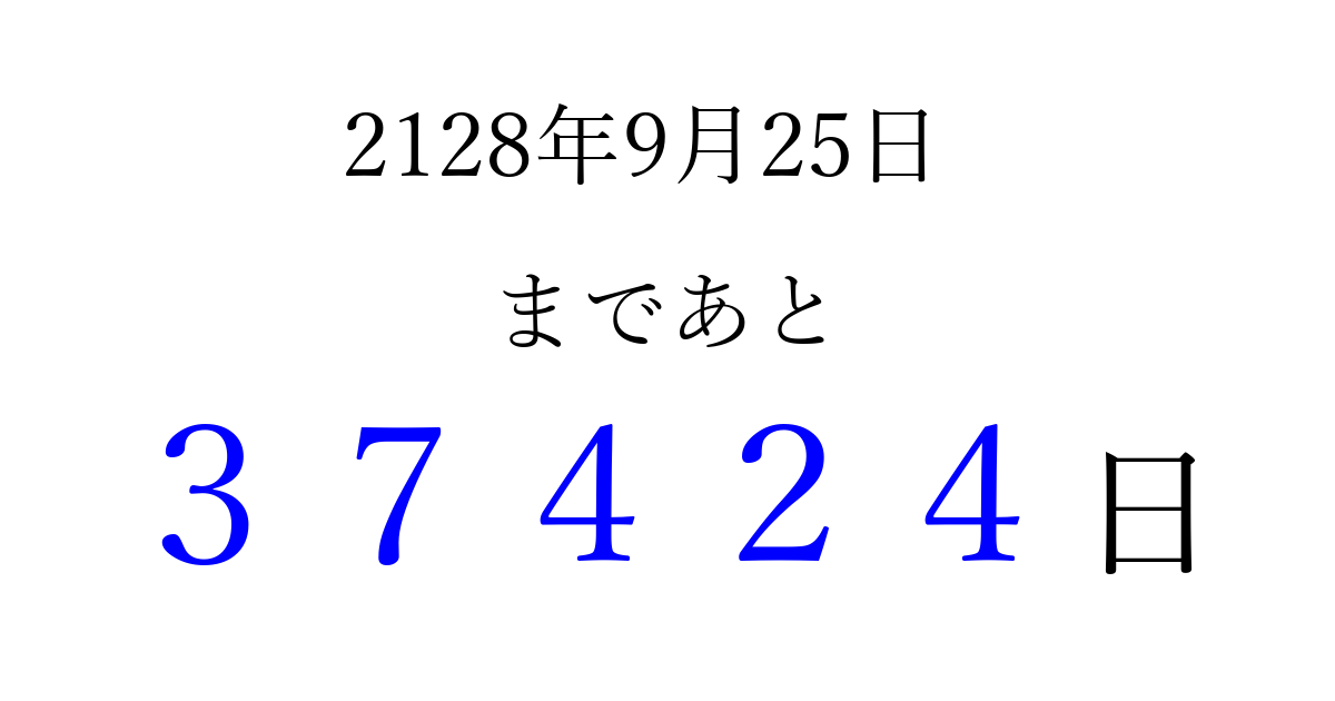 2128年9月25日(土)まで あと 99999 日です 追加すると、トップページからすぐ選べるようになります ※2026/04/09現在の結果です。 最新の状態に更新する ↓シェアして、タイムライン上にカウントダウンを表示しよう!↓ 📤 この結果を共有する Tweet シェア Threads Bluesky 別の日付でカウントダウン 2128年9月のカレンダー このページをブックマークに追加すると、いつでもカウントダウンを確認できます。 (PC: Ctrl+D / Mac: ⌘+D) hitome-notes.comでは以下のページも運営しています。 指定日と期間から日付を計算 | ガチャ確率計算・シミュレーション | プライバシー・ポリシー 運営者:Avocado
