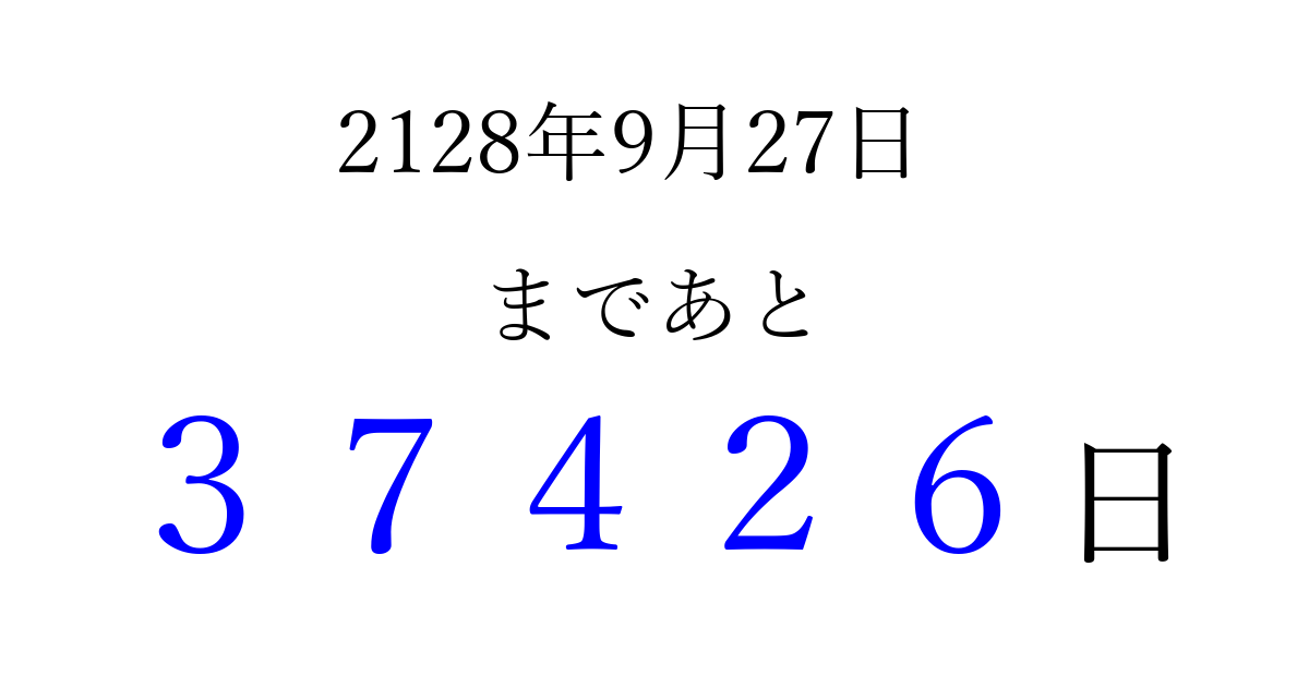 2128年9月27日(月)まで あと 99999 日です 追加すると、トップページからすぐ選べるようになります ※2026/04/09現在の結果です。 最新の状態に更新する ↓シェアして、タイムライン上にカウントダウンを表示しよう!↓ 📤 この結果を共有する Tweet シェア Threads Bluesky 別の日付でカウントダウン 2128年9月のカレンダー このページをブックマークに追加すると、いつでもカウントダウンを確認できます。 (PC: Ctrl+D / Mac: ⌘+D) hitome-notes.comでは以下のページも運営しています。 指定日と期間から日付を計算 | ガチャ確率計算・シミュレーション | プライバシー・ポリシー 運営者:Avocado
