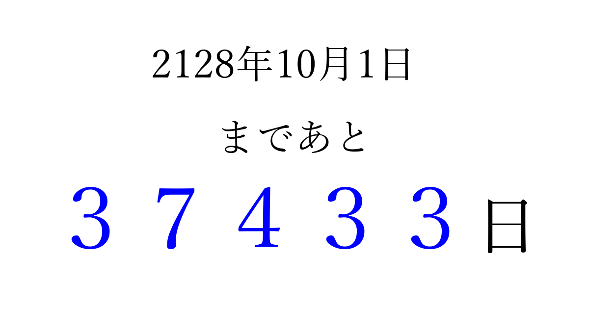 2128年10月1日(金)まで あと 99999 日です 追加すると、トップページからすぐ選べるようになります ※2026/04/06現在の結果です。 最新の状態に更新する ↓シェアして、タイムライン上にカウントダウンを表示しよう!↓ 📤 この結果を共有する Tweet シェア Threads Bluesky 別の日付でカウントダウン 2128年10月のカレンダー このページをブックマークに追加すると、いつでもカウントダウンを確認できます。 (PC: Ctrl+D / Mac: ⌘+D) hitome-notes.comでは以下のページも運営しています。 指定日と期間から日付を計算 | ガチャ確率計算・シミュレーション | プライバシー・ポリシー 運営者:Avocado