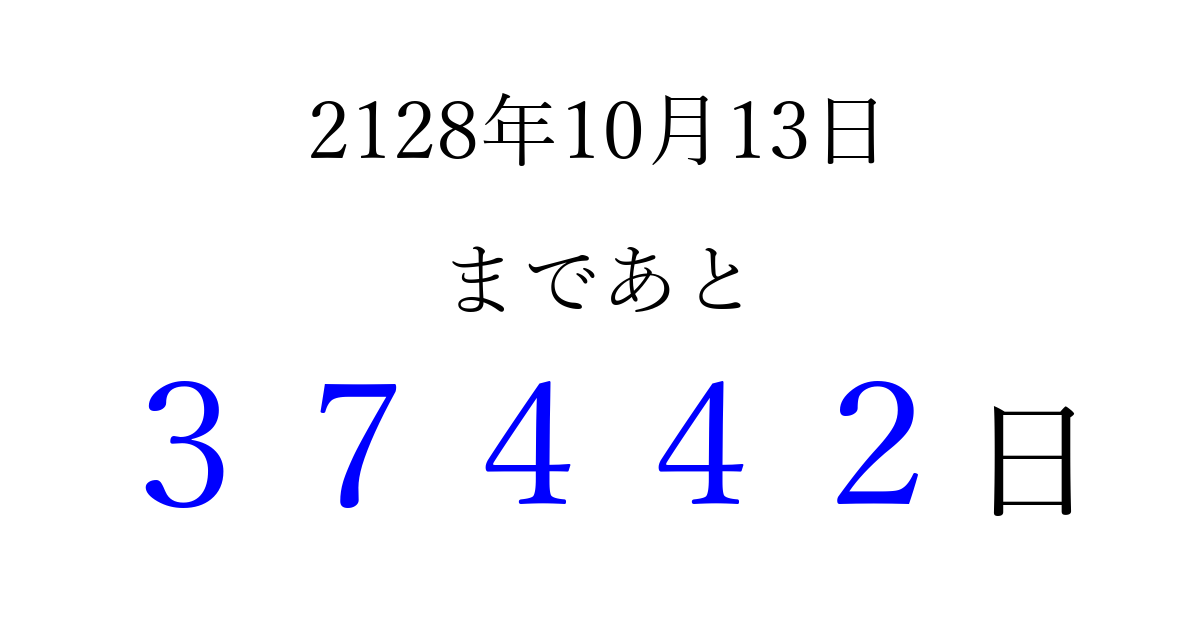 2128年10月13日(水)まで あと 99999 日です 追加すると、トップページからすぐ選べるようになります ※2026/04/09現在の結果です。 最新の状態に更新する ↓シェアして、タイムライン上にカウントダウンを表示しよう!↓ 📤 この結果を共有する Tweet シェア Threads Bluesky 別の日付でカウントダウン 2128年10月のカレンダー このページをブックマークに追加すると、いつでもカウントダウンを確認できます。 (PC: Ctrl+D / Mac: ⌘+D) hitome-notes.comでは以下のページも運営しています。 指定日と期間から日付を計算 | ガチャ確率計算・シミュレーション | プライバシー・ポリシー 運営者:Avocado
