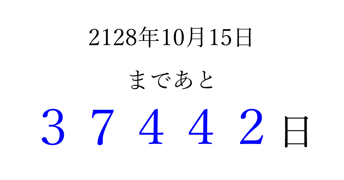 2128年10月15日(金)まで あと 99999 日です 追加すると、トップページからすぐ選べるようになります ※2026/04/11現在の結果です。 最新の状態に更新する ↓シェアして、タイムライン上にカウントダウンを表示しよう!↓ 📤 この結果を共有する Tweet シェア Threads Bluesky 別の日付でカウントダウン 2128年10月のカレンダー このページをブックマークに追加すると、いつでもカウントダウンを確認できます。 (PC: Ctrl+D / Mac: ⌘+D) hitome-notes.comでは以下のページも運営しています。 指定日と期間から日付を計算 | ガチャ確率計算・シミュレーション | プライバシー・ポリシー 運営者:Avocado