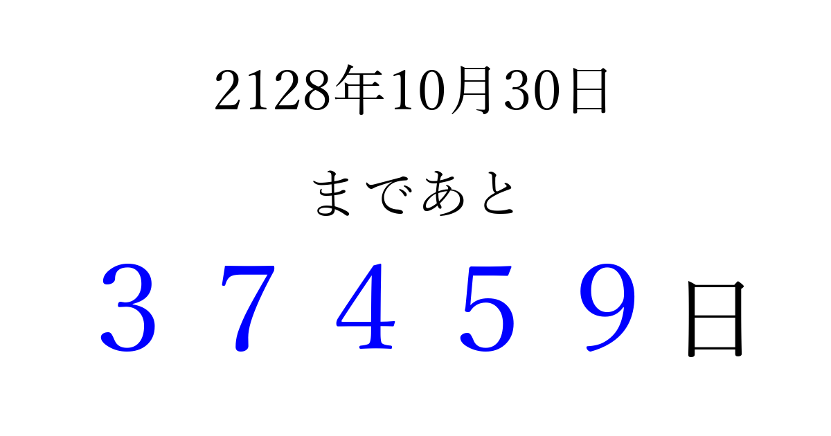 2128年10月30日(土)まで あと 99999 日です 追加すると、トップページからすぐ選べるようになります ※2026/04/09現在の結果です。 最新の状態に更新する ↓シェアして、タイムライン上にカウントダウンを表示しよう!↓ 📤 この結果を共有する Tweet シェア Threads Bluesky 別の日付でカウントダウン 2128年10月のカレンダー このページをブックマークに追加すると、いつでもカウントダウンを確認できます。 (PC: Ctrl+D / Mac: ⌘+D) hitome-notes.comでは以下のページも運営しています。 指定日と期間から日付を計算 | ガチャ確率計算・シミュレーション | プライバシー・ポリシー 運営者:Avocado