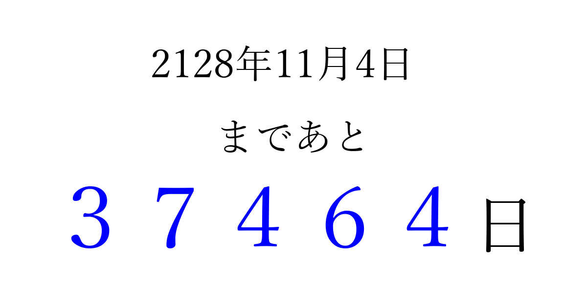 2128年11月4日(木)まで あと 99999 日です 追加すると、トップページからすぐ選べるようになります ※2026/04/09現在の結果です。 最新の状態に更新する ↓シェアして、タイムライン上にカウントダウンを表示しよう!↓ 📤 この結果を共有する Tweet シェア Threads Bluesky 別の日付でカウントダウン 2128年11月のカレンダー このページをブックマークに追加すると、いつでもカウントダウンを確認できます。 (PC: Ctrl+D / Mac: ⌘+D) hitome-notes.comでは以下のページも運営しています。 指定日と期間から日付を計算 | ガチャ確率計算・シミュレーション | プライバシー・ポリシー 運営者:Avocado