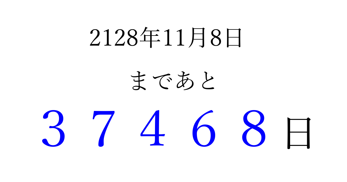 2128年11月8日(月)まで あと 99999 日です 追加すると、トップページからすぐ選べるようになります ※2026/04/09現在の結果です。 最新の状態に更新する ↓シェアして、タイムライン上にカウントダウンを表示しよう!↓ 📤 この結果を共有する Tweet シェア Threads Bluesky 別の日付でカウントダウン 2128年11月のカレンダー このページをブックマークに追加すると、いつでもカウントダウンを確認できます。 (PC: Ctrl+D / Mac: ⌘+D) hitome-notes.comでは以下のページも運営しています。 指定日と期間から日付を計算 | ガチャ確率計算・シミュレーション | プライバシー・ポリシー 運営者:Avocado