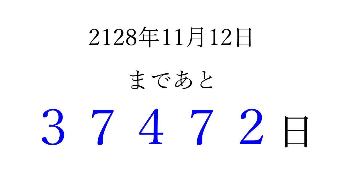 2128年11月12日(金)まで あと 99999 日です 追加すると、トップページからすぐ選べるようになります ※2026/04/09現在の結果です。 最新の状態に更新する ↓シェアして、タイムライン上にカウントダウンを表示しよう!↓ 📤 この結果を共有する Tweet シェア Threads Bluesky 別の日付でカウントダウン 2128年11月のカレンダー このページをブックマークに追加すると、いつでもカウントダウンを確認できます。 (PC: Ctrl+D / Mac: ⌘+D) hitome-notes.comでは以下のページも運営しています。 指定日と期間から日付を計算 | ガチャ確率計算・シミュレーション | プライバシー・ポリシー 運営者:Avocado