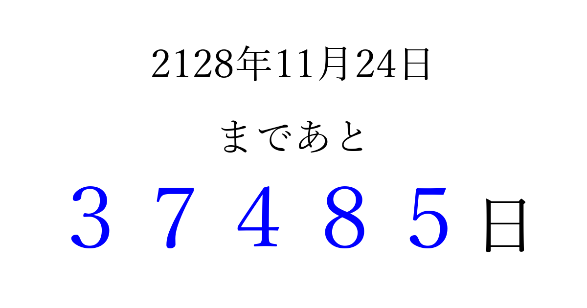2128年11月24日(水)まで あと 99999 日です 追加すると、トップページからすぐ選べるようになります ※2026/04/08現在の結果です。 最新の状態に更新する ↓シェアして、タイムライン上にカウントダウンを表示しよう!↓ 📤 この結果を共有する Tweet シェア Threads Bluesky 別の日付でカウントダウン 2128年11月のカレンダー このページをブックマークに追加すると、いつでもカウントダウンを確認できます。 (PC: Ctrl+D / Mac: ⌘+D) hitome-notes.comでは以下のページも運営しています。 指定日と期間から日付を計算 | ガチャ確率計算・シミュレーション | プライバシー・ポリシー 運営者:Avocado