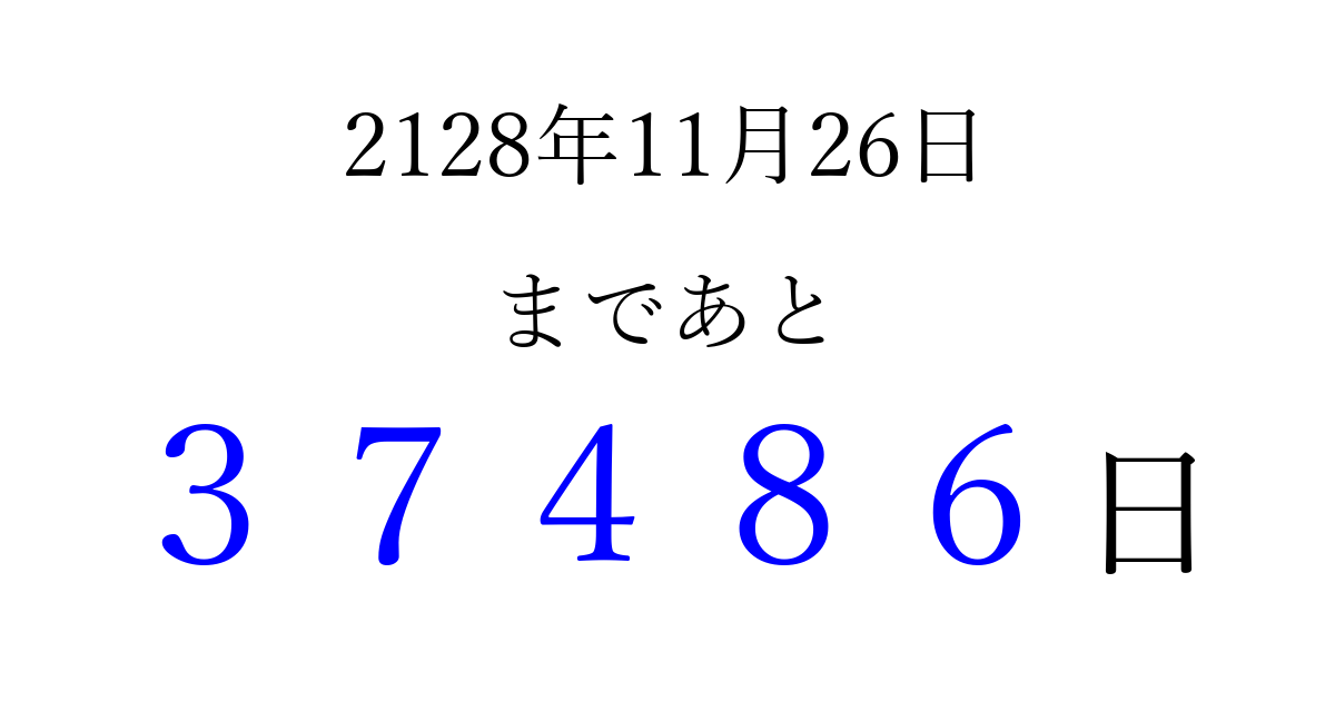 2128年11月26日(金)まで あと 99999 日です 追加すると、トップページからすぐ選べるようになります ※2026/04/09現在の結果です。 最新の状態に更新する ↓シェアして、タイムライン上にカウントダウンを表示しよう!↓ 📤 この結果を共有する Tweet シェア Threads Bluesky 別の日付でカウントダウン 2128年11月のカレンダー このページをブックマークに追加すると、いつでもカウントダウンを確認できます。 (PC: Ctrl+D / Mac: ⌘+D) hitome-notes.comでは以下のページも運営しています。 指定日と期間から日付を計算 | ガチャ確率計算・シミュレーション | プライバシー・ポリシー 運営者:Avocado