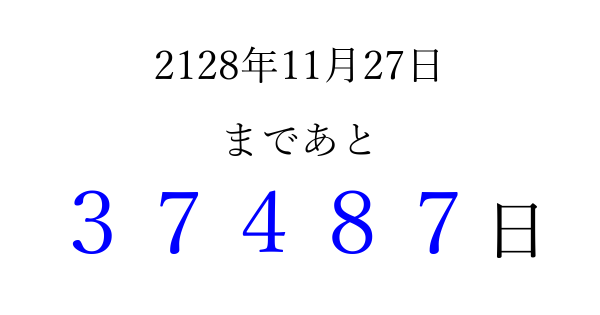 2128年11月27日(土)まで あと 99999 日です 追加すると、トップページからすぐ選べるようになります ※2026/04/09現在の結果です。 最新の状態に更新する ↓シェアして、タイムライン上にカウントダウンを表示しよう!↓ 📤 この結果を共有する Tweet シェア Threads Bluesky 別の日付でカウントダウン 2128年11月のカレンダー このページをブックマークに追加すると、いつでもカウントダウンを確認できます。 (PC: Ctrl+D / Mac: ⌘+D) hitome-notes.comでは以下のページも運営しています。 指定日と期間から日付を計算 | ガチャ確率計算・シミュレーション | プライバシー・ポリシー 運営者:Avocado