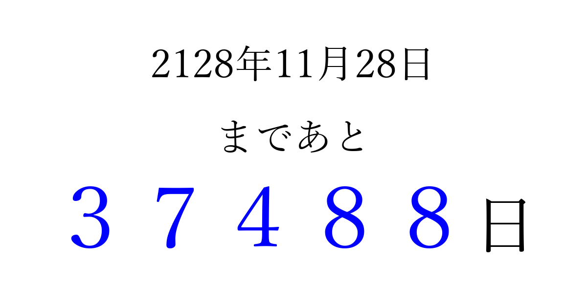 2128年11月28日(日)まで あと 99999 日です 追加すると、トップページからすぐ選べるようになります ※2026/04/09現在の結果です。 最新の状態に更新する ↓シェアして、タイムライン上にカウントダウンを表示しよう!↓ 📤 この結果を共有する Tweet シェア Threads Bluesky 別の日付でカウントダウン 2128年11月のカレンダー このページをブックマークに追加すると、いつでもカウントダウンを確認できます。 (PC: Ctrl+D / Mac: ⌘+D) hitome-notes.comでは以下のページも運営しています。 指定日と期間から日付を計算 | ガチャ確率計算・シミュレーション | プライバシー・ポリシー 運営者:Avocado