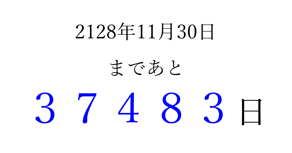 2128年11月30日(火)まで あと 99999 日です 追加すると、トップページからすぐ選べるようになります ※2026/04/16現在の結果です。 最新の状態に更新する ↓シェアして、タイムライン上にカウントダウンを表示しよう!↓ 📤 この結果を共有する Tweet シェア Threads Bluesky 別の日付でカウントダウン 2128年11月のカレンダー このページをブックマークに追加すると、いつでもカウントダウンを確認できます。 (PC: Ctrl+D / Mac: ⌘+D) hitome-notes.comでは以下のページも運営しています。 指定日と期間から日付を計算 | ガチャ確率計算・シミュレーション | プライバシー・ポリシー 運営者:Avocado