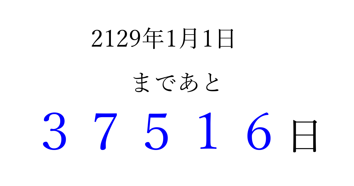 2129年1月1日(土)まで あと 99999 日です 追加すると、トップページからすぐ選べるようになります ※2026/04/15現在の結果です。 最新の状態に更新する ↓シェアして、タイムライン上にカウントダウンを表示しよう!↓ 📤 この結果を共有する Tweet シェア Threads Bluesky 別の日付でカウントダウン 2129年1月のカレンダー このページをブックマークに追加すると、いつでもカウントダウンを確認できます。 (PC: Ctrl+D / Mac: ⌘+D) hitome-notes.comでは以下のページも運営しています。 指定日と期間から日付を計算 | ガチャ確率計算・シミュレーション | プライバシー・ポリシー 運営者:Avocado