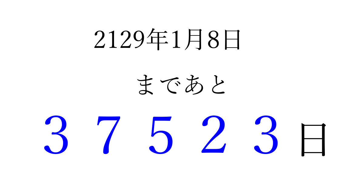2129年1月8日(土)まで あと 99999 日です 追加すると、トップページからすぐ選べるようになります ※2026/04/15現在の結果です。 最新の状態に更新する ↓シェアして、タイムライン上にカウントダウンを表示しよう!↓ 📤 この結果を共有する Tweet シェア Threads Bluesky 別の日付でカウントダウン 2129年1月のカレンダー このページをブックマークに追加すると、いつでもカウントダウンを確認できます。 (PC: Ctrl+D / Mac: ⌘+D) hitome-notes.comでは以下のページも運営しています。 指定日と期間から日付を計算 | ガチャ確率計算・シミュレーション | プライバシー・ポリシー 運営者:Avocado
